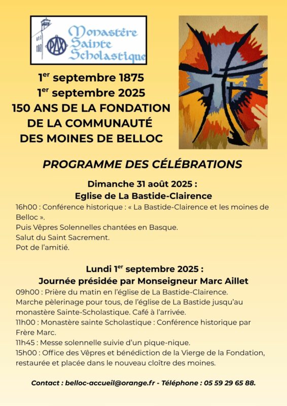 Les moines et moniales bénédictins de Belloc à Urt vous invitent à participer aux célébrations des 150 ans de la fondation de la communauté des moines de Belloc qui se dérouleront le dimanche 31 août et le lundi 1er septembre 2025.