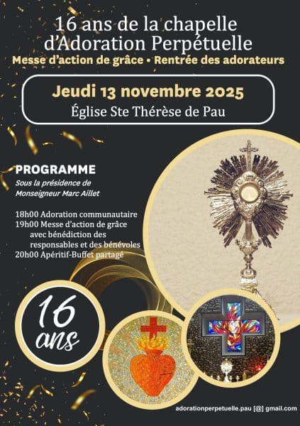 Jeudi 13 novembre 2025 à partir de 18h, la chapelle d’Adoration Perpétuelle de l’église Sainte-Thérèse de Pau fêtera son 16ème anniversaire sous la présidence de Monseigneur Marc Aillet.—