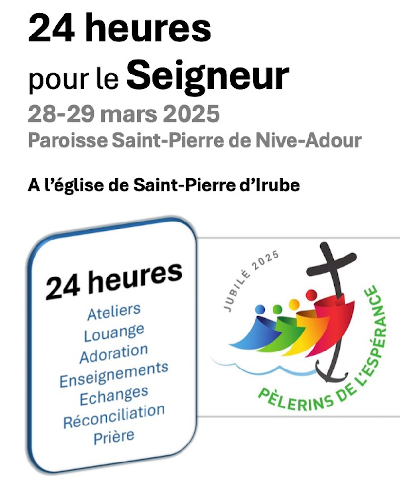 Le vendredi 28 et samedi 29 mars 2025, auront lieu les « 24h pour le Seigneur » à l’église St-Pierre de St-Pierre d’Irube, pour tous les paroissiens de St-Pierre de Nive Adour, autour de trois fondamentaux : la prière, le sacrement de la réconciliation, le partage de la Bonne Nouvelle.