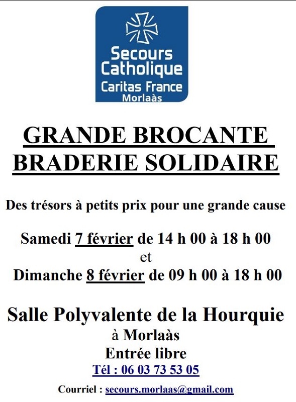 La grande braderie annuelle du secours catholique de Morlaàs aura lieu le samedi 7 février 2026 (de 14h à 18h) et le dimanche 8 février 2026 (de 9h à 18h), à la salle polyvalente, place de la Hourquie.