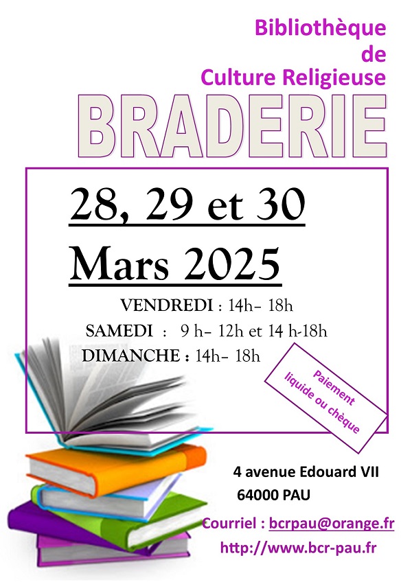 La braderie de la bibliothèque de culture religieuse de Pau aura lieu du vendredi 28 mars 2025 au dimanche 30 mars 2025.