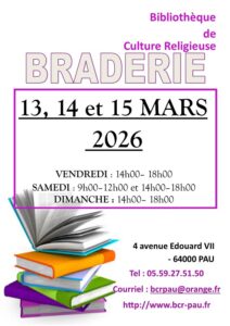 La braderie de la Bibliothèque de Culture Religieuse de Pau aura lieu du vendredi 13 mars 2026 au dimanche 15 mars 2026, 4 av. Edouard VII (derrière la Chapelle des Réparatrices).