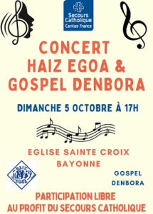 Le Secours Catholique – Caritas France organise un concert choral le dimanche 5 octobre 2025, à 17h, à l’église Sainte-Croix à Bayonne. Ce concert de deux chorales (Le chœur d’hommes Haiz Egoa et Gospel Denbora) est organisé au profit des actions locales du Secours Catholique, présent dans 10 lieux au Pays basque.