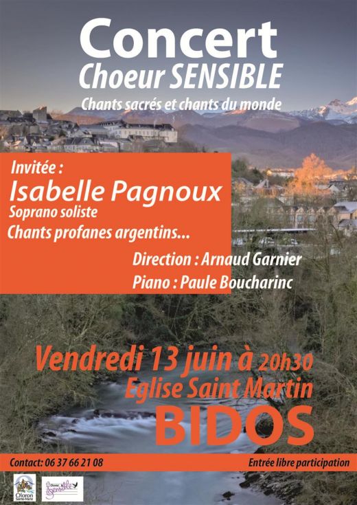 Vendredi 13 juin 2025 à 20h30, à l’église Saint-Martin de Bidos, le Choeur Sensible d’Oloron-Sainte-Marie, chorale mixte à quatre voix dirigée par Arnaud Garnier propose un répertoire varié, constitué de chants traditionnels et populaires du monde, de gospels, de chants sacrés et liturgiques. Les interprétations a cappella se sont enrichies d’oeuvres avec accompagnement piano par Paule Boucharinc. A l’occasion de ce concert, Sensible a le plaisir d’inviter la soprano soliste Isabelle Pagnoux qui interprètera des mélodies profanes argentines, des mélodies françaises et sacrées.