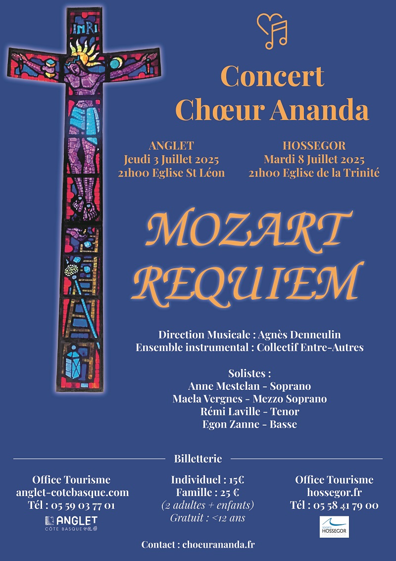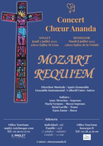 Le Chœur Ananda interprètera le Requiem de Mozart, sous la direction musicale d’Agnès Denneulin et l’ensemble instrumental « Collectif Entre-Autres » en l’église Saint-Léon d’Anglet le jeudi 3 juillet 2025 à 21h.