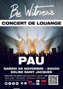 Le samedi 29 novembre 2025, de 20h à 22h, à l’église Saint-Jacques de Pau, le groupe Be Witness (sois témoin) conduit les participants de tous âges à faire l’expérience d’un réel coeur à coeur avec Dieu par une louange entraînante, des chants profonds et par leur témoignage durant leurs concerts. — Depuis 10 ans, c’est en développant un style de musique pop que le groupe souhaite rejoindre la culture contemporaine afin d’annoncer Jésus au monde d’aujourd’hui.