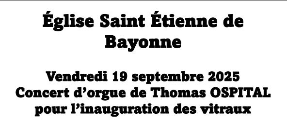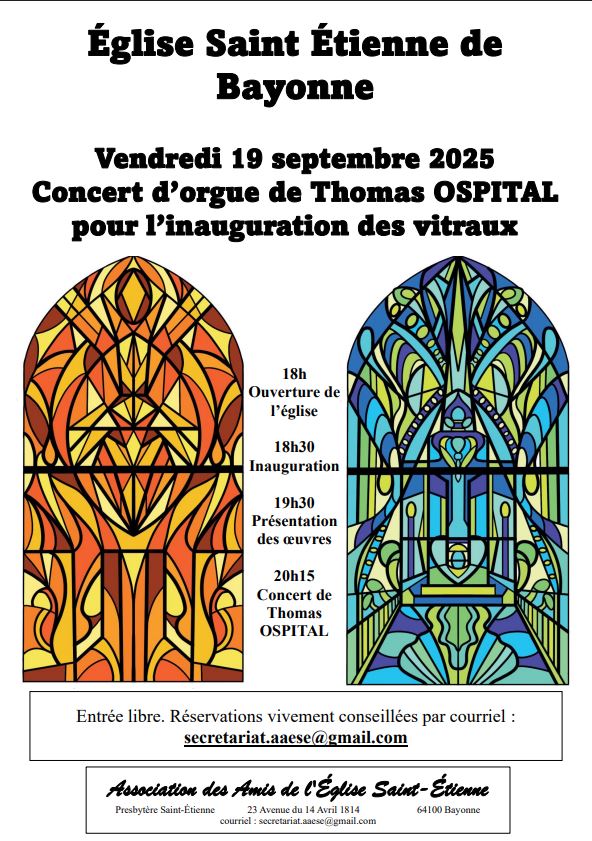 Vendredi 19 septembre 2025 à 20h15 aura lieu un concert d’orgue donné par l’organiste Thomas Ospital en l’honneur de l’inauguration de deux nouveaux vitraux de l’église à l’église St Étienne de Bayonne.