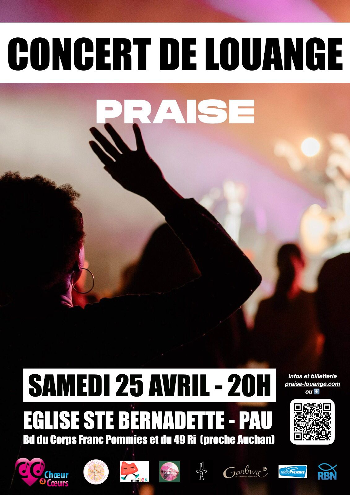 Le 25 avril à 20h, un concert du groupe Praise aura lieu à l’église Sainte Bernadette de Pau, organisé par l’association Chœur à cœur.