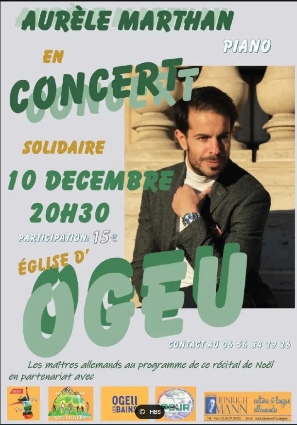 La municipalité d’Ogeu et l’abbé Jean-Marie Barennes accueillent, mercredi 10 décembre 2025 à 20h30 en l’église d’Ogeu-les-Bains, un magnifique concert solidaire organisé par l’association « Pour » au profit de « Haut Béarn Solidaire ». Le pianiste Aurèle Marthan interprétera les œuvres de maîtres allemands. Au programme : Jean-Sébastien Bach, Ludwig van Beethoven, Franz Schubert, Franz Liszt.