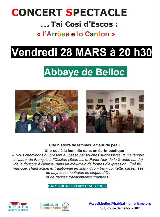 Vendredi 28 mars 2025 à 20h30, à l’abbaye de Belloc, le groupe des Tai Cosi présente « L’ Arròsa e lo Cardon », une histoire de femmes, à fleur de peau, une ode à la féminité dans un écrin poétique. Méli-Mélo de formes d’expression : poésie, musique, chant actuel et traditionnel en solo-duo-trio-quintette, parsemées de saynètes théâtrales en langue d’oc et de danses traditionnelles chantées.