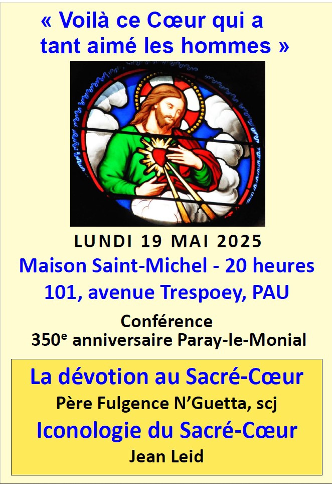 Lundi 19 mai 2025 à 20h, à la Maison Saint-Michel de Pau, se tiendra une conférence à deux voix sur le Sacré-Coeur, (Père Fulgence N’Guetta, scj, « la dévotion au Sacré-Cœur » et Jean Leid « Iconologie du Sacré-Cœur »), dans le cadre du 350° anniversaire de l’apparition de 1675 à Marguerite Marie Alacoque à Paray-le-Monial.