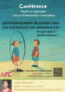 À l’établissement Immaculée Conception de Pau (7Bd Edouard Herriot), mardi 30 septembre 2025 à 20h30, les AFC (Associations Familiales Catholiques) de Pau organisent une conférence animée par Aude Mirkovic, Maître de conférence en droit et Présidente de l’association Juriste pour l’enfance, sur le thème : « Questionnement de genre chez les enfants et les adolescents ». De quoi s’agit-il ? Quelles Réponses ?