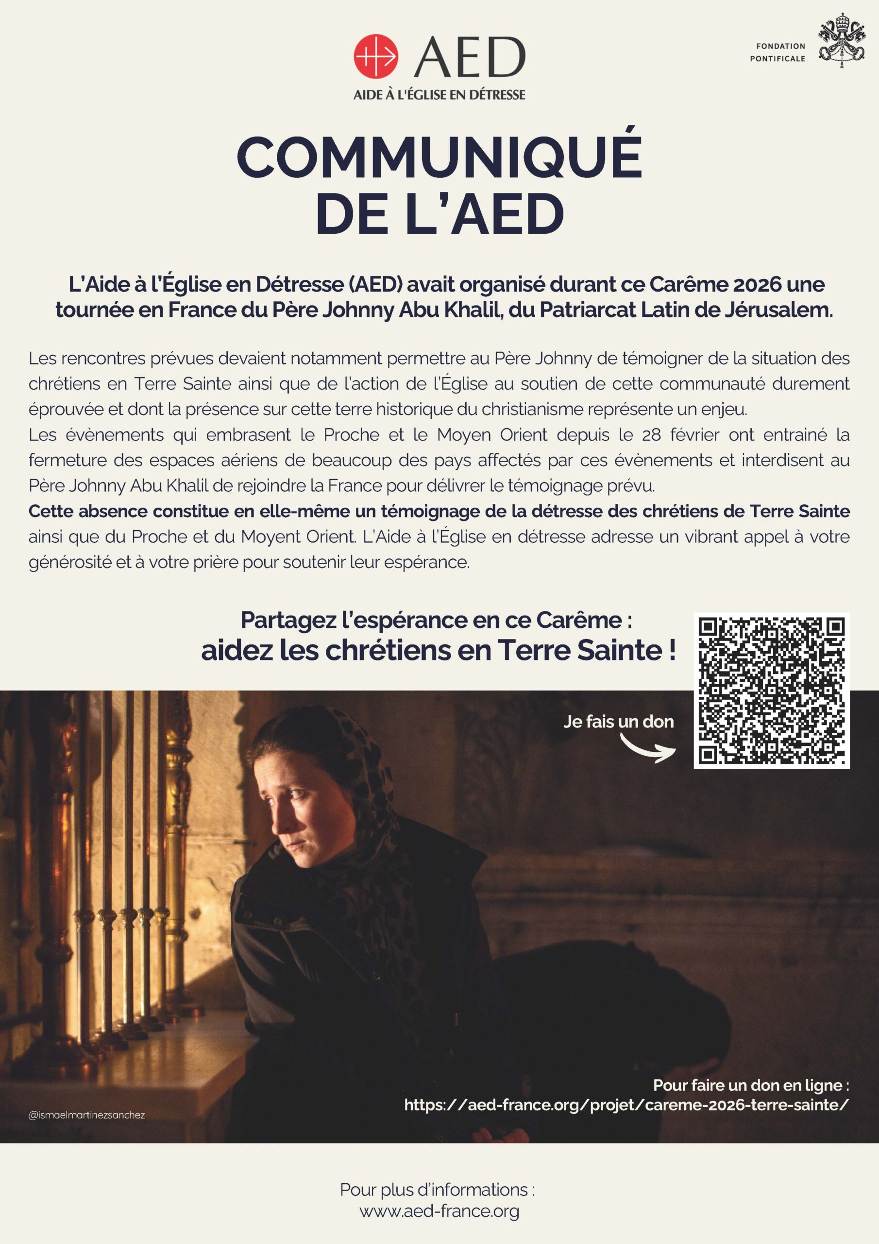 Dimanche 15 mars 2026 à 14h30, l’association Aide à l’Église en détresse organise une conférence exceptionnelle sur le thème « Quel avenir pour les chrétiens de Terre Sainte ? » par le Père Johnny Abu Khalil du Patriarcat Latin de Jérusalem, à la paroisse Sainte-Marie d’Anglet. La conférence sera précédée de la messe à 11h.—