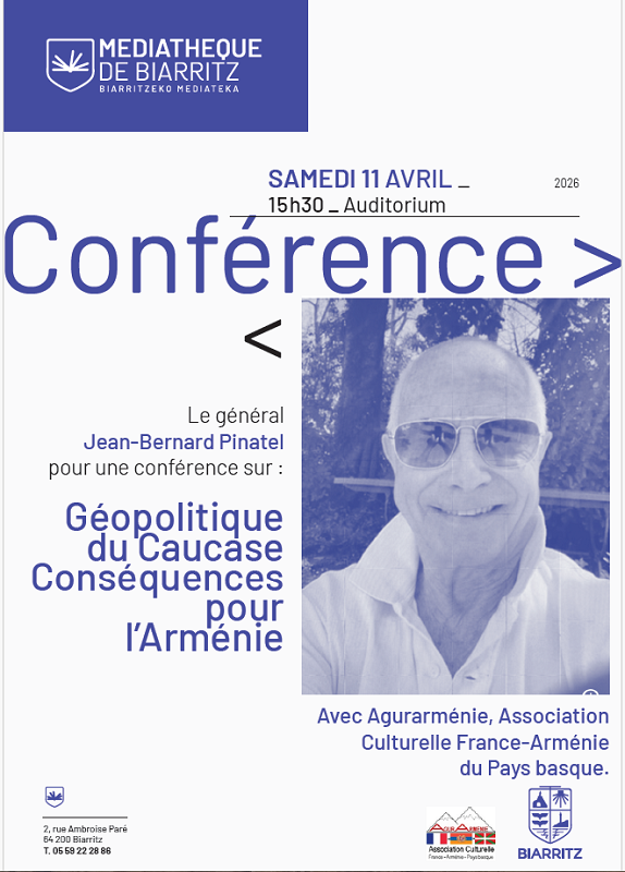 Samedi 11 avril 2026 à 15h 30, l’association AgurArménie et l’Association Culturelle France-Arménie du Pays basque organisent une conférence sur le thème « Géopolitique du Caucase, Conséquences pour l’Arménie », par le Général Jean-Bernard Pinatel, spécialiste des enjeux géostratégiques, notamment dans la région du Caucase, à l’auditorium de la Médiathèque de Biarritz. —