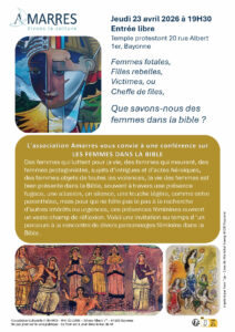 L’association culturelle Amarres vous invite à une conférence donnée le jeudi 23 Avril 2026 à 19H30 par Corinne Lanoir, professeur de théologie, intitulée « Femmes fatales, filles rebelles, victimes ou cheffes de files, que savons-nous des femmes dans la bible? ». Cette conférence se tiendra au temple protestant de Bayonne (20 rue Albert Premier).