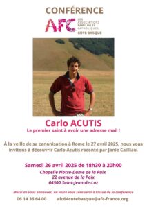 Samedi 26 avril 2025 de 18h30 à 20h, à la veille de la canonisation de Carlo Acutis à Rome le dimanche 27 avril, les Associations Familiales Catholiques (AFC) de la Côte basque organisent une conférence sur « le premier saint à avoir une adresse mail », à la Chapelle Notre Dame de la Paix (22 av de La Paix) à St-Jean-de-Luz. Un verre vous sera proposé à l’issue de la conférence de Janie Caillieau.