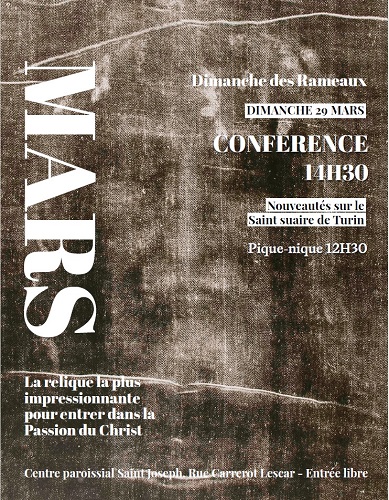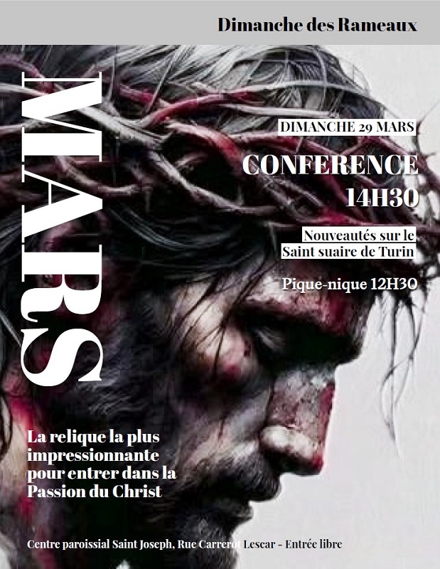 Dimanche 29 mars 2026 à 14h30, dimanche des Rameaux, la paroisse de Lescar organise une conférence sur le Saint Suaire, au centre paroissial Saint-Joseph (26 rue Carrerot à Lescar), conférence pour entrer dans la semaine sainte, et mieux méditer sur la passion du Christ.
