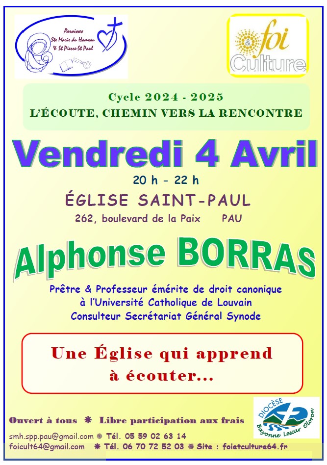 Le cycle 2024-2025 « L’écoute, chemin vers la rencontre » organisé conjointement par le service Foi et Culture et les paroisses St Pierre -St Paul et Ste Marie du Hameau, propose une conférence vendredi 4 avril à 20h, église St-Paul, 262 bd de la Paix à Pau.