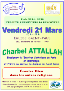 Le cycle 2024-2025 « L’écoute, chemin vers la rencontre » organisé conjointement par le service Foi et Culture et les paroisses St Pierre-St Paul et Ste Marie du Hameau, propose une conférence vendredi 21 mars à 20h, église St-Paul, 262 bd de la Paix à Pau.