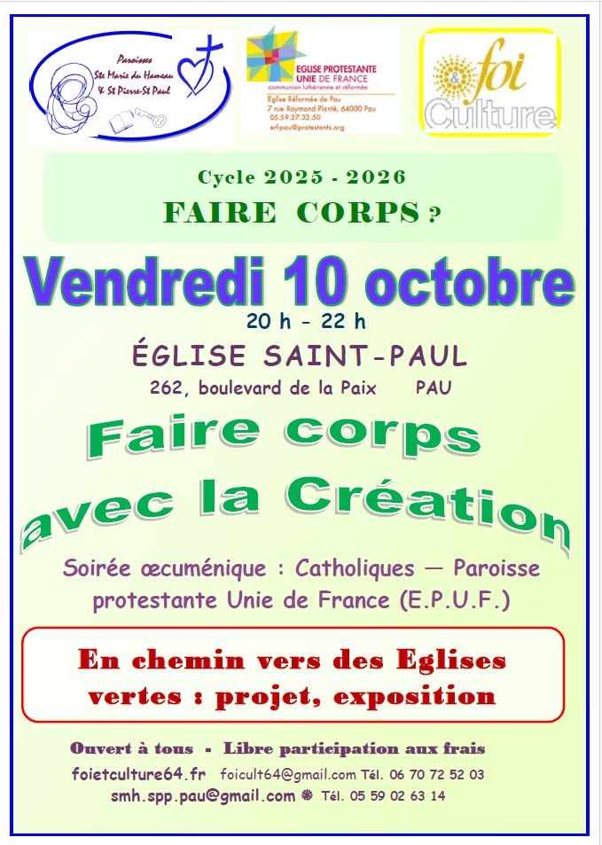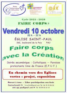 La soirée inaugurale sera œcuménique (catholiques – Paroisse Protestante Unie de France E.P.U.F) est proposée vendredi 10 octobre 2025 de 20h à 22h, à l’église St-Paul, 262 bd de la Paix à Pau. Le thème : « Faire corps avec la création »