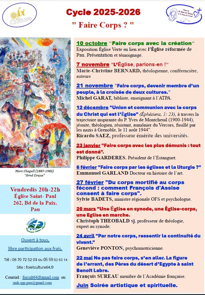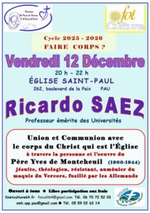 Le thème retenu pour le cycle 2025-2026 de Foi et Culture est : « Faire corps ? ». Organisée conjointement par le service Foi et Culture et les paroisses St Pierre -St Paul et Ste Marie du Hameau, la conférence de décembre a lieu le vendredi 12 décembre 2025 de 20h à 22h, à l’église St-Paul, 262 bd de la Paix à Pau.