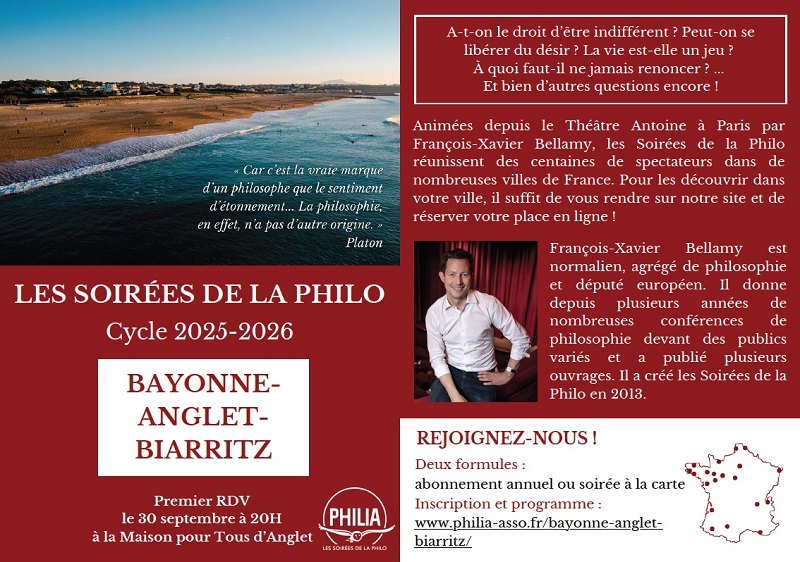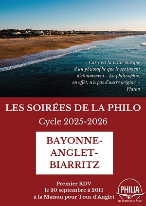 L’association Philia BAB (Bayonne/Anglet/Biarritz) propose de découvrir les soirées de la philo : un cycle de 14 conférences (retransmises depuis Paris), où chaque soirée aborde une question ouverte pour inviter à prendre du recul, en toute simplicité. Pas besoin de diplôme et pas d’examen à la sortie, mais l’occasion d’échanger après la conférence pour ceux qui le souhaitent.
