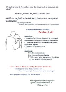 Le Service diocésain de Pastorale liturgique et sacramentelle propose deux journées dans le cadre de la formation continue pour les équipes de la pastorale du deuil : salle paroissiale de Salies-de-Béarn, de 9h30 à 16 h, le jeudi 29 janvier et le jeudi 12 mars 2026. Elle est ouverte aux Equipes funérailles et à toutes les personnes qui désireraient rejoindre ce service d’Eglise. Le thème : « Célébrer au funérarium et au crématorium sans passer par l’Église ».