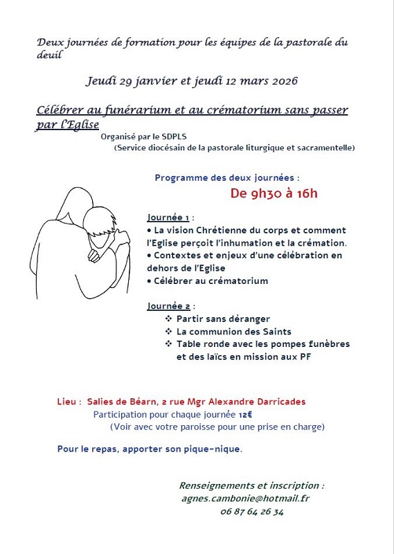 Le Service diocésain de Pastorale liturgique et sacramentelle propose deux journées dans le cadre de la formation continue pour les équipes de la pastorale du deuil : salle paroissiale de Salies-de-Béarn, de 9h30 à 16 h, le jeudi 29 janvier et le jeudi 12 mars 2026. Elle est ouverte aux Equipes funérailles et à toutes les personnes qui désireraient rejoindre ce service d’Eglise. Le thème : « Célébrer au funérarium et au crématorium sans passer par l’Église ».