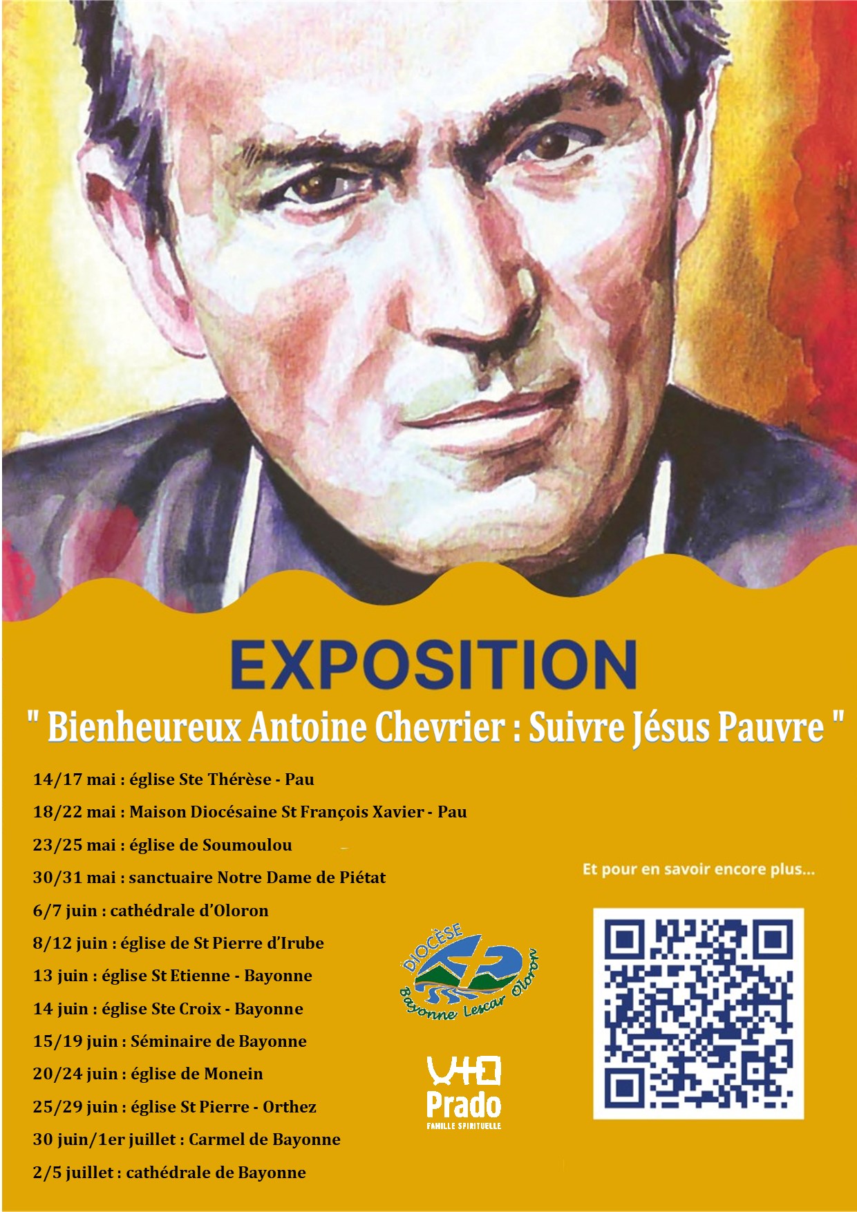 Du jeudi 14 mai 2026 au dimanche 5 juillet 2026, la famille spirituelle du Prado organise une exposition itinérante en différents lieux du diocèse, du Bienheureux Antoine Chevrier : « Suivre Jésus Pauvre ». —