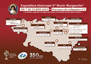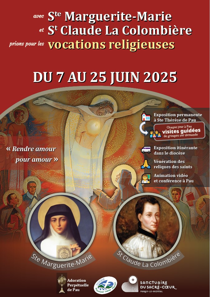 Du samedi 7 au mercredi 25 juin 2025, une exposition permanente consacrée à sainte Marguerite-Marie et saint Claude La Colombière sera installée en l’église Sainte-Thérèse de Pau, à l’occasion des 350 ans des apparitions à Paray-le-Monial. En parallèle, des visites guidées de groupes seront organisées sur demande à Pau, ainsi qu’une exposition itinérante dans le diocèse et autres animations afin de prier pour les vocations religieuses.