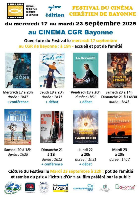 Pour la 7e année, le Festival du Cinéma Chrétien de Bayonne vous propose durant 7 jours de venir au cinéma pour voir ou revoir 8 films d’obédience chrétienne, avec 4 soirées ciné-débats et 2 conférences.