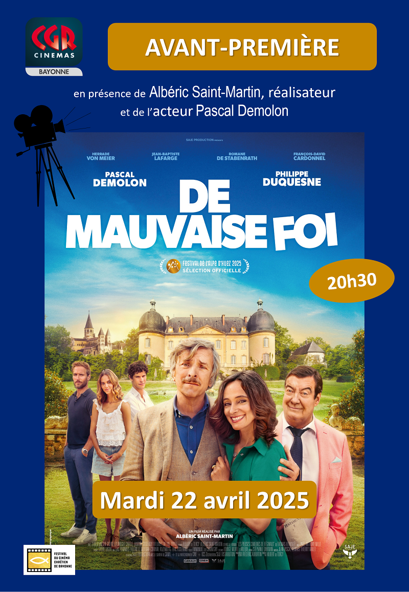 Mardi 22 avril 2025 à 20h30, séance cinéma au CGR Bayonne « De mauvaise foi ». Le film sera en avant-première en présence du réalisateur Albéric Saint-Martin et de l’acteur Pascal Demolon.