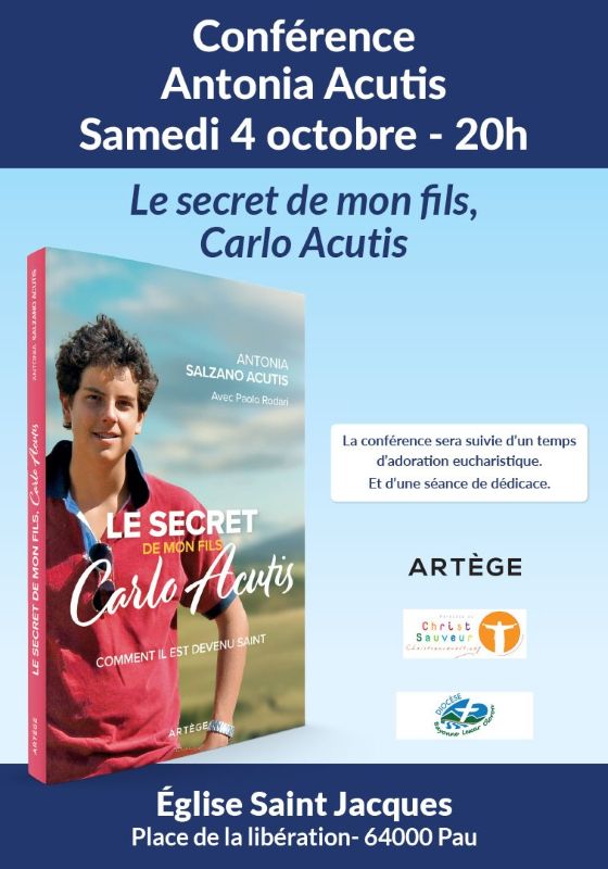 Samedi 4 octobre 2025 à 20h, aura lieu une soirée témoignage et adoration eucharistique avec Antonia Salzano Acutis, la maman de saint Carlo Acutis (canonisé le 7 septembre 2025), en l’église St-Jacques de Pau.