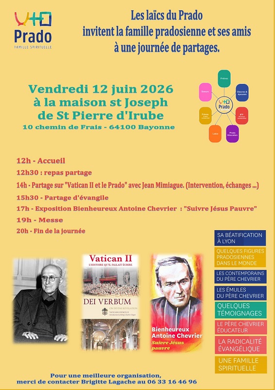 Vendredi 12 juin 2026 de 12h00 à 20h00, les laïcs du Prado invitent la famille et les amis du Prado à une journée de partages à la maison St Joseph de St Pierre d’Irube (10 chemin de Frais – 64100 Bayonne). —