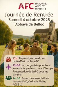 L’Association Familiale Catholique du BAB (Bayonne-Anglet-Biarritz) organise une journée de rentrée le samedi 4 octobre 2025 de 12h à 16h30, à l’Abbaye de Belloc.