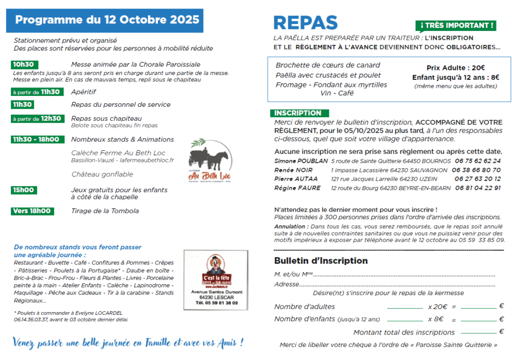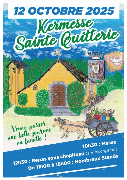 La paroisse de Sainte-Quitterie organise sa kermesse dimanche 12 octobre 2025 de 10h30 à 18h.Toutes les activités ont lieu au sanctuaire : messe animée par la Chorale Paroissiale à 10h30, repas sous chapiteau à partir de 12h30 (20€), Nombreux stands et animations, Calèche, Tombola…
