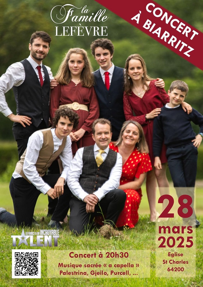 Vendredi 28 mars 2025 à 20h30, la famille Lefèvre, révélée par l’émission « la France a un incroyable talent » donnera un concert de musique sacrée « a capella » à l’église Saint Charles de Biarritz.