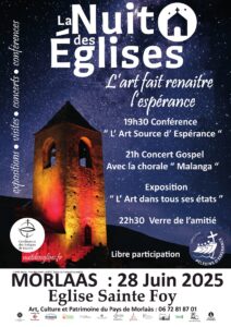 Samedi 28 juin 2025, en l’église Sainte-Foy de Morlaàs, à l’occasion de la Nuit des églises, la paroisse et l’Association Art, Culture et Patrimoine du Pays de Morlaàs proposent différents évènements sous le thème « L’art fait renaître l’espérance ».