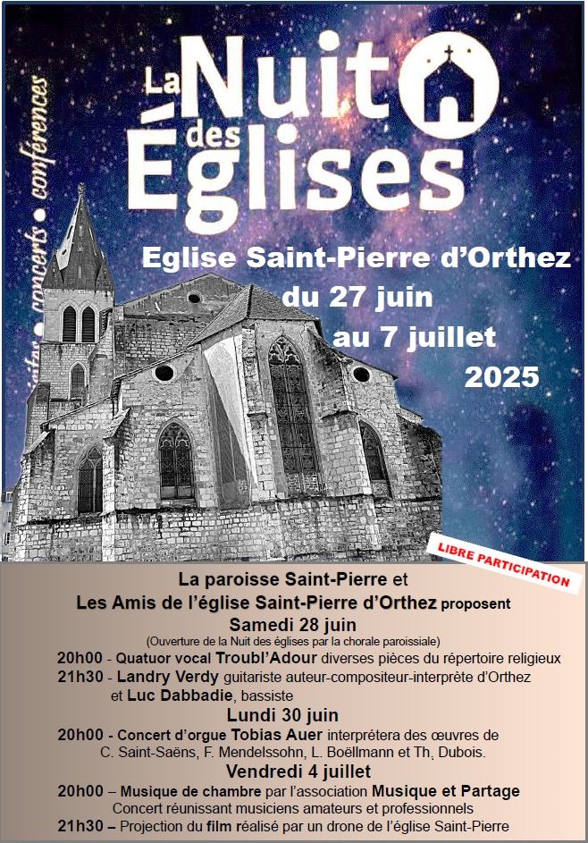 À l’occasion de la Nuit des églises, la paroisse Saint-Pierre et Les Amis de l’église Saint-Pierre d’Orthez proposent différents évènements musicaux :