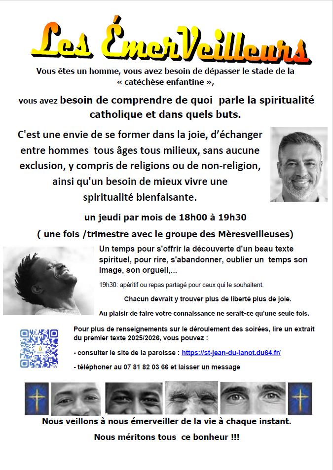 Dans le sillon des « Mères veilleuses », la paroisse St Jean du Lanot lance un nouveau groupe pour les hommes : les « Emerveilleurs ». La première rencontre aura lieu jeudi 9 octobre 2025 de 18h à 19h30, à la salle paroissiale de Bizanos, suivie pour ceux qui le souhaitent d’un apéritif ou repas partagé.