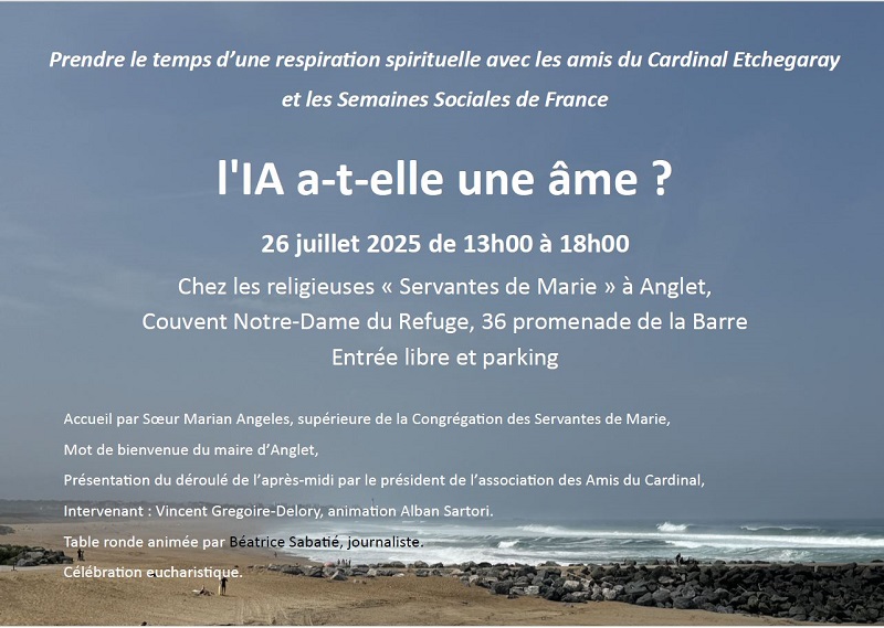 L’événement intitulé « Prendre le temps d’une respiration spirituelle avec les amis du Cardinal Etchegaray et les Semaines Sociales de France » se tiendra le 26 juillet 2025 de 13h à 18h au Couvent Notre-Dame du Refuge à Anglet, chez les religieuses « Servantes de Marie ». Le thème central est : « L’IA a-t-elle une âme ? » .