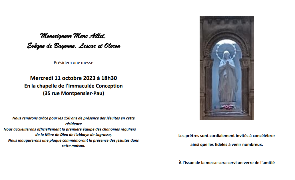 Monseigneur Marc Aillet, présidera une messe mercredi 11 octobre à 18h30 chapelle de l’Immaculée Conception (35 rue Montpensier) à Pau.
