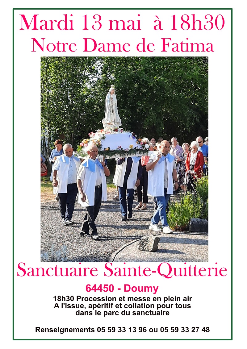 Mardi 13 mai 2025, de 18h à 20h, comme chaque année depuis le 13 mai 2000, la paroisse de Sainte Quitterie organise une procession et une messe en plein air en l’honneur de Notre Dame de Fatima (repli dans une église proche en cas de pluie). À l’issue, apéritif et collation portugaise pour tous dans le parc du sanctuaire (Sanctuaire sur la RD 40 au Nord de Pau et au sud de Doumy)