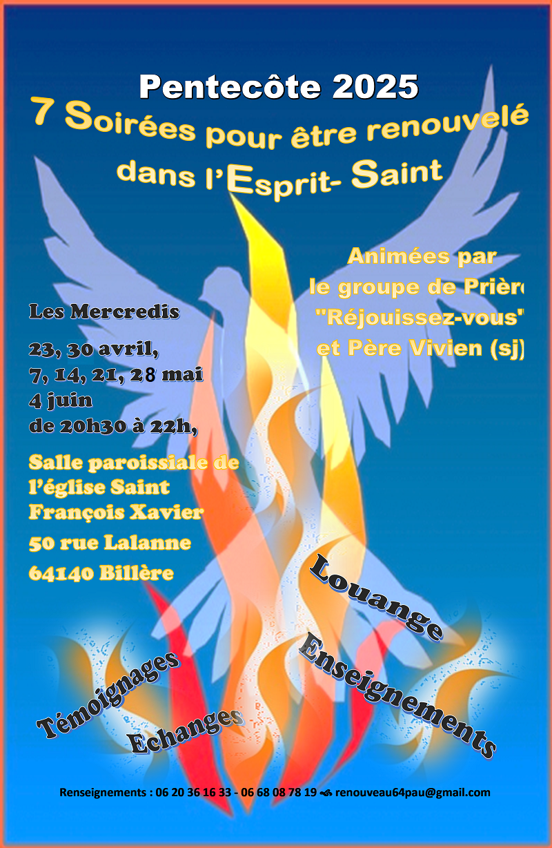 7 soirées pour être renouvelé dans l’Esprit-Saint qui auront lieu tous les mercredis du 23 avril au 4 juin, de 20h30 à 22h dans la salle paroissiale de l’Église Saint François-Xavier (50 rue Lalanne – Billère).