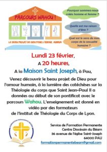 Le service de Formation Permanente du Béarn propose le parcours Wahou animé par l’abbé Pierre Haramburu et Marie-Line Sillières, afin de découvrir la théologie du corps selon Saint Jean-Paul II et le beau projet de Dieu pour l’amour humain. L’enseignement est donné en vidéo par des formateurs de l’Institut de Théologie du Corps de Lyon.