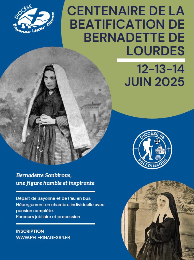 Le service des pèlerinages du diocèse propose un pèlerinage à Lourdes à l’occasion du centenaire de la béatification de sainte Bernadette, du jeudi 12 au samedi 14 juin 2025.