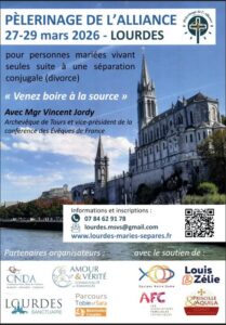 Le pèlerinage national de l’Alliance pour les personnes mariées, vivant seules à la suite d’une séparation ou d’un divorce se déroulera cette année à Lourdes du vendredi 27 mars au dimanche 29 mars 2026, avec Mgr Vincent Jordy (Archevêque de Tours).
