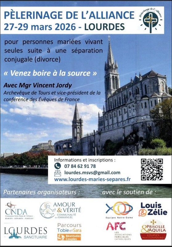 Le pèlerinage national de l’Alliance pour les personnes mariées, vivant seules à la suite d’une séparation ou d’un divorce se déroulera cette année à Lourdes du vendredi 27 mars au dimanche 29 mars 2026, avec Mgr Vincent Jordy (Archevêque de Tours).