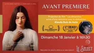 Dimanche 18 janvier 2026 à 16h30, aura lieu en avant-première, la projection du film « LES DIMANCHES », au cinéma « Le Select » à Saint-Jean-de-Luz, suivie d’une rencontre avec la réalisatrice Alauda Ruiz de Azùa.