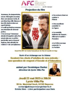 Jeudi 22 mai 2025 à 20h30, L’Association Familiale Catholique de la côte basque organise une séance cinéma « Tout mais pas ça », au Lycée Villa Pia de Bayonne, film suivi d’un échange animé par Dominique Duriez, Directeur du Lycée Villa Pia, sur le thème : Soutenir les choix d’adultes de nos enfants : une question de respect, d’écoute et d’éducation.